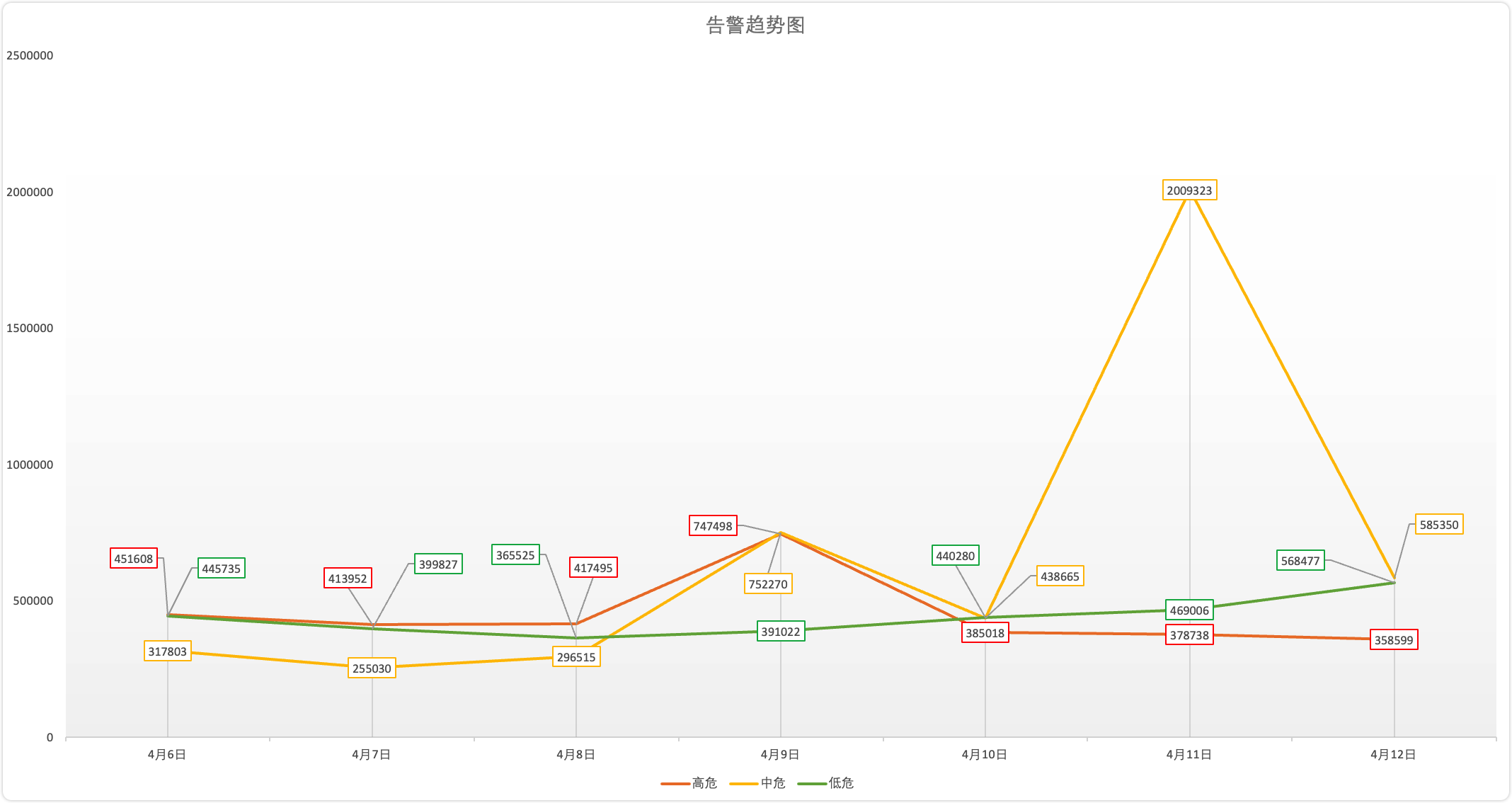 2025年04月06日至2026年04月12日内告警产生情况,高危告警3152908条、中危告警4654956条、低危告警3079872条。